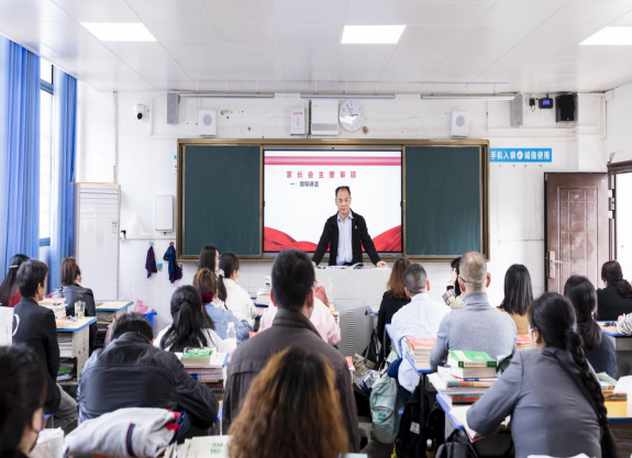 黄石六中校长赵川以同声广播的方式发表了讲话。他首先对各位家长积极出席表示感谢,然后从学校的具体情况、班级的多元设置、教学的认真严谨、学生的科学管理、家校共育重要性等多方面、多角度和家长们进行交流。同时希望家长加强与学校的沟通、优化教育理念、与子女有效交流、营造温暖和睦家庭氛围,为共同教育好孩子而不断努力。