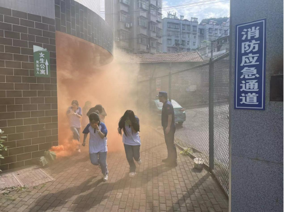 随着临江社区主任徐勇的口令和警报的响起,教官及老师迅速组织学生疏散逃生。学生们按照指定路线,猫着腰,用湿巾捂着嘴鼻迅速有序地进行紧急疏散。学生们在第一时间撤离到校园的安全地带。