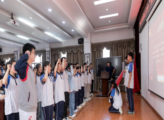 大会在嘹亮的国歌中拉开序幕。随后,团委副书记李仁玉宣布新团员名单,由校领导、相关处室负责人、年级主任和青年团员教师为新团员佩戴团徽,新团员进行入团宣誓。