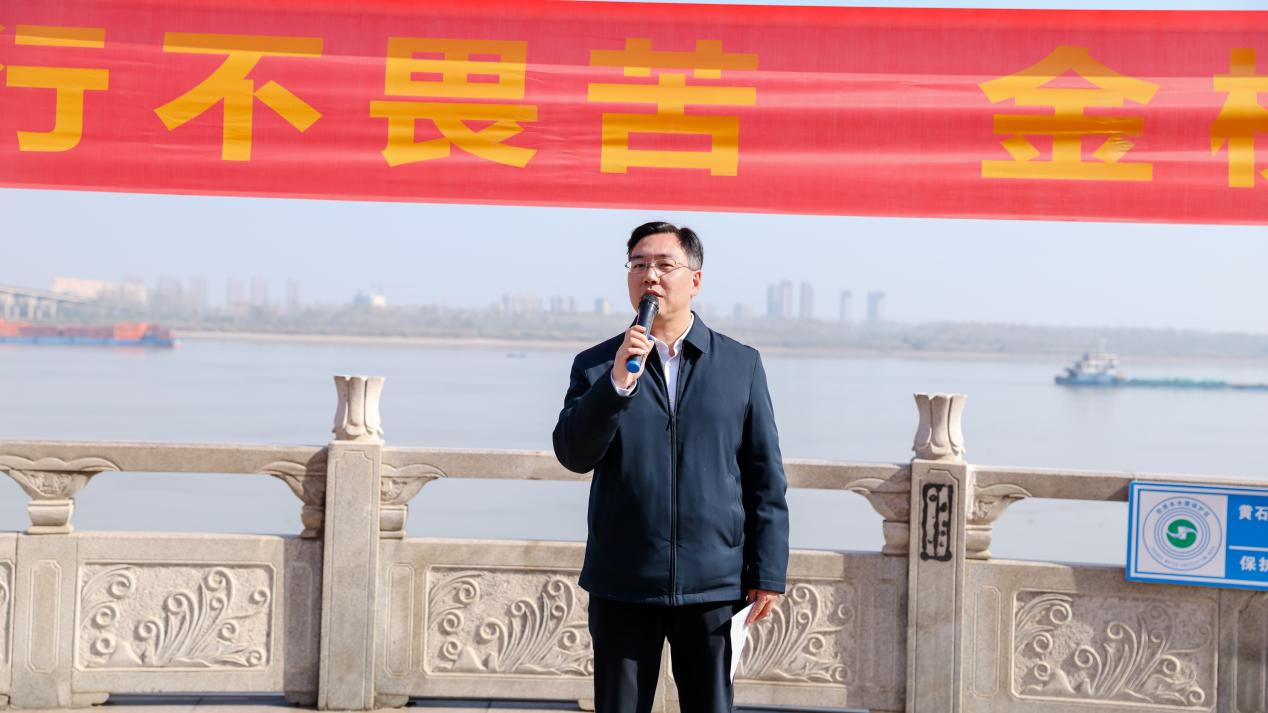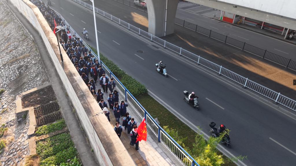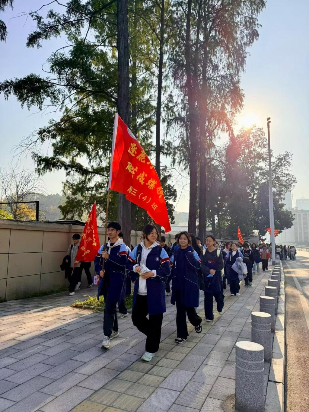 8点整,校长赵川庄严宣布:"黄石六中2026届高三复习备考200天冲刺励志远足活动,现在开始!"十个班级在班旗的引领下,按照顺序有序出发,踏上了远足征程。