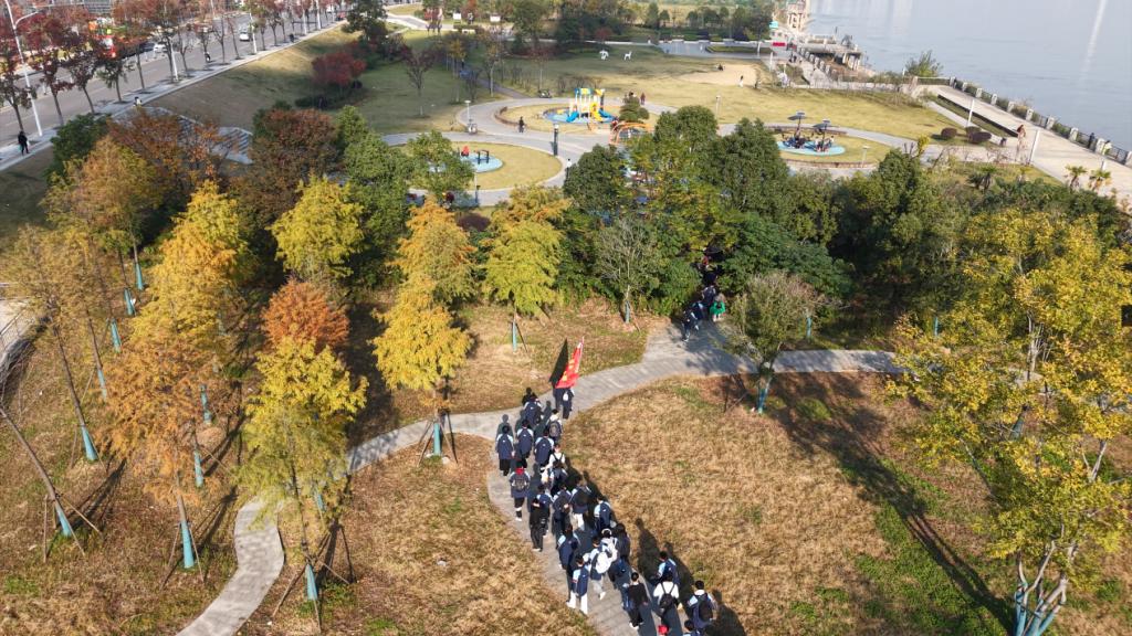 沿途设有三个精心设计的打卡点,学生们在每个点位盖章留念,集齐三个印章即完成远足任务。行进途中,同学们互相鼓励,口号声声,展现了良好的精神风貌和班级凝聚力。到达终点朝阳阁后,各班在正门处合影留念,并在签名墙上郑重签名,记录下这难忘的一刻。