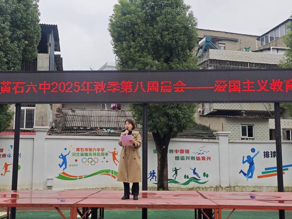 为进一步加强青少年思想道德建设,弘扬爱国主义精神,10月20日清晨,黄石六中全体师生齐聚学校操场,隆重举行了第八周主题晨会。本次晨会以爱国主义教育为核心内容,由学校党政办副主任朱莉老师担任主讲。