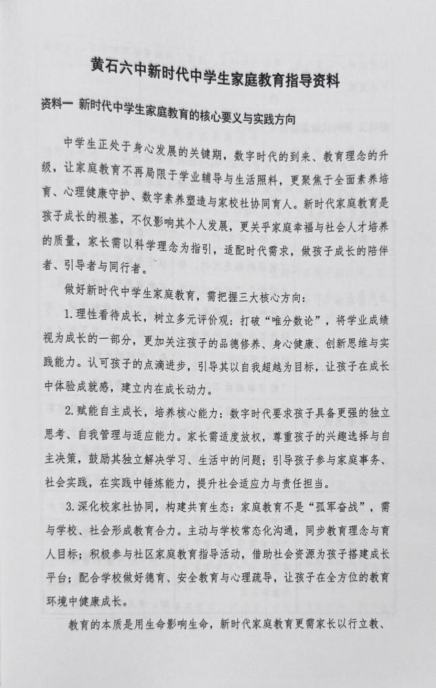 会上,我校向全体参会家长发放《黄石六中新时代中学生家庭教育指导资料》,为家长开展科学家庭教育、提升育人能力提供系统指引与专业支持。