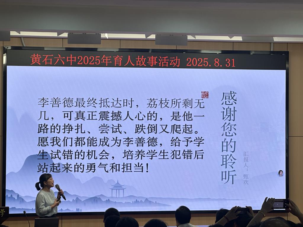 10时20分,“讲述我的育人故事”环节温暖开启。高一甄欢、高二伊小丽、高三陈强三位老师作为代表,用朴实而深情的语言,分享了教育生活中的动人片段。他们用“小事”见证“大爱”,以“故事”传递“温度”,深深打动了在场每一位教师,彰显了六中人的教育情怀与使命担当。