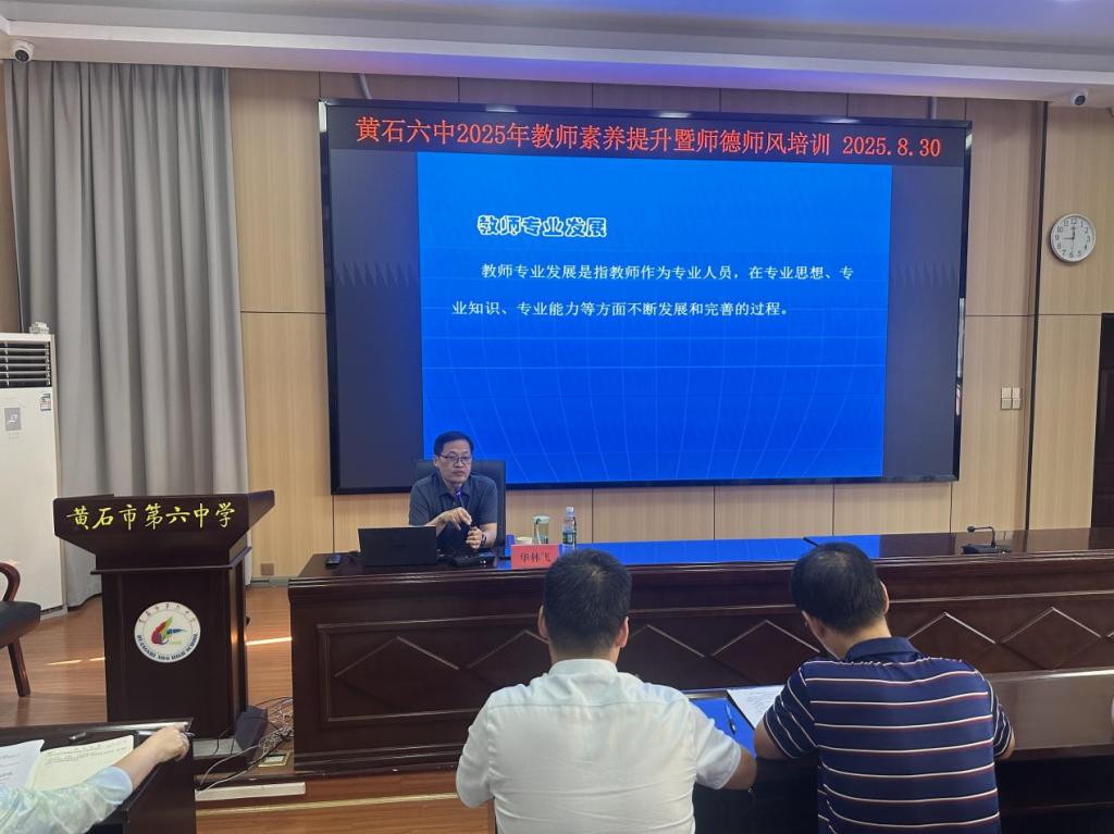 为全面提升教师综合素养、加强师德师风建设、系统总结高考备考经验,谋划新学期教育教学工作,8月30日至31日,黄石六中组织开展了2025年教师素养提升暨师德师风培训系列活动。全体教职工齐聚学校六楼多功能报告厅,共同参加了为期一天半的集中研修。