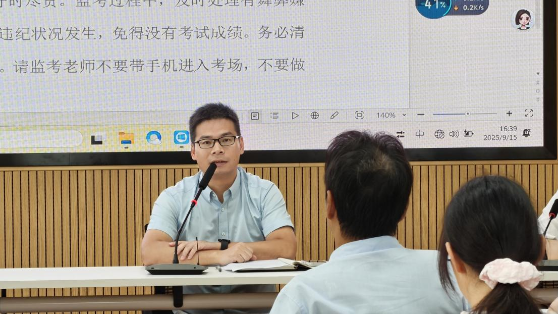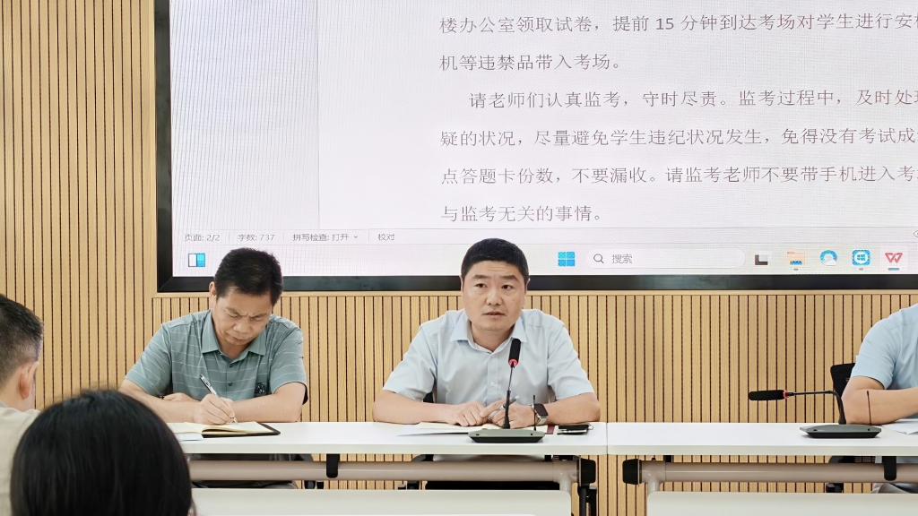 会上,吴爱军主任首先就本次考试的考务工作进行全面、细致地安排部署。对考场布置规范、监考人员职责、试卷收发流程、应急情况处理等关键环节逐一展开说明,清晰界定各岗位工作标准与时间节点,强调考务人员需严守纪律,杜绝违规,保障考试严肃性与规范性。