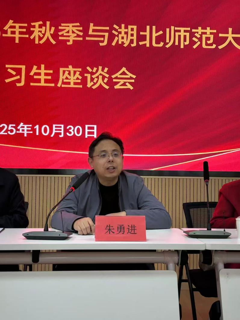 2025年10月30日上午,黄石六中与湖北师范大学实习生座谈会在学校智慧教室举行。湖北师范大学外国语学院副院长朱勇进教授、外国语学院综合技能教研室主任商志霞,音乐舞蹈学院高月霞教授、黄石六中教学副校长苏畅,以及全体实习生及带教老师共同参与。本次座谈会由教务处章雪倩老师主持。
